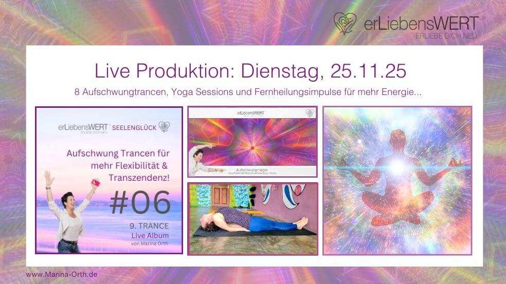 Jeder Dienstag ist für die Heil-Trancen als feste Auszeit reserviert und der Donnertag steht mit den Bonusvideos nach Lust und Laune unter dem Motto: „ERLIEBE DICH NEU!“ mit meiner Yin Yoga Essenz zum ausprobieren zur Verfügung.